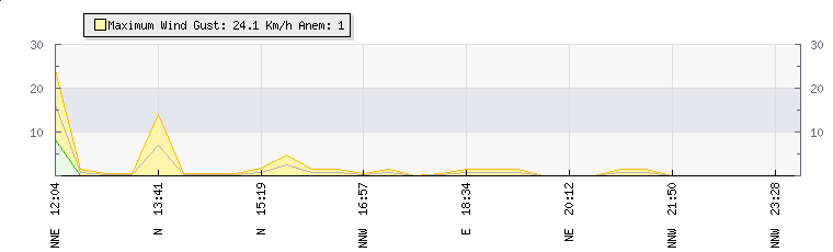 In the last few minutes the wind was North North West at an average speed of 0 kmh, reaching up to 0 kmh and a low of 0 kmh. The gust strength is0 kmh above the minimum speed |