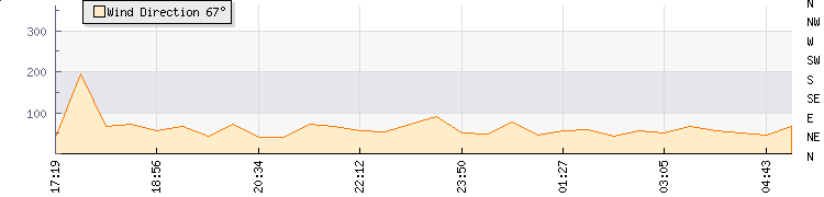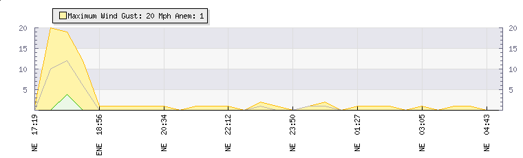 In the last few minutes the wind was North Easterly at an average speed of 1 mph, reaching up to 1 mph and a low of 0 mph. The gust strength is1 mph above the minimum speed |
