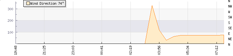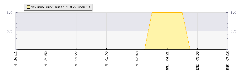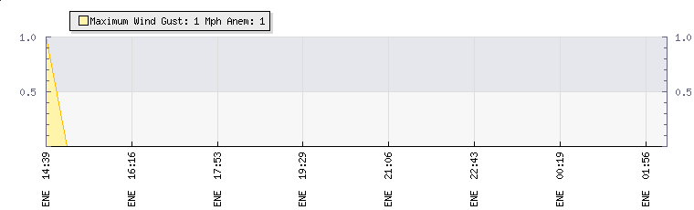 In the last few minutes the wind was East North East at an average speed of 0 mph, reaching up to 0 mph and a low of 0 mph. The gust strength is0 mph above the minimum speed |