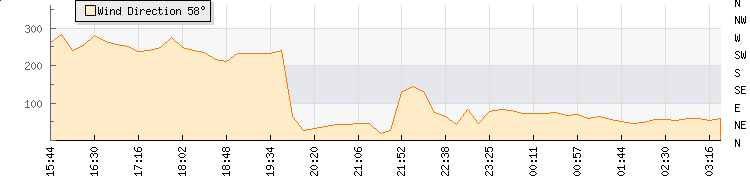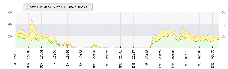 In the last few minutes the wind was North Easterly at an average speed of 15 kmh, reaching up to 20 kmh and a low of 11 kmh. The gust strength is9 kmh above the minimum speed |