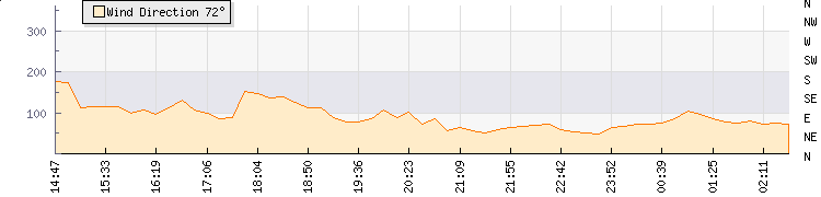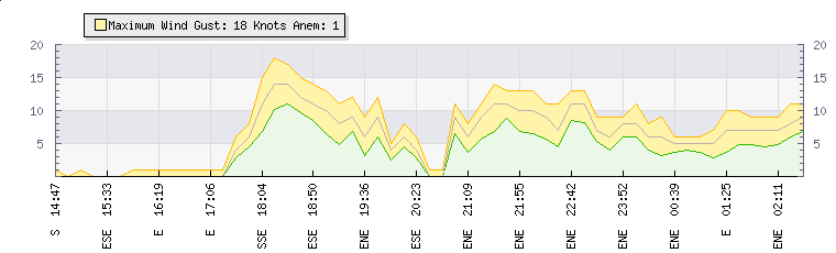 In the last few minutes the wind was East South East at an average speed of 5 knots, reaching up to 6 knots and a low of 4 knots. The gust strength is2 knots above the minimum speed |