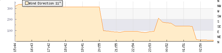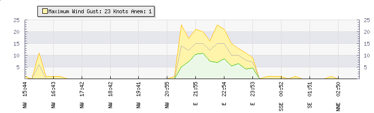 In the last few minutes the wind was South Easterly at an average speed of 0 knots, reaching up to 0 knots and a low of 0 knots. The gust strength is0 knots above the minimum speed |