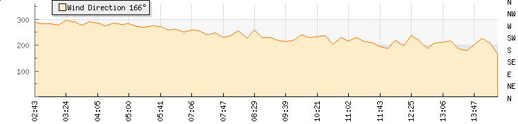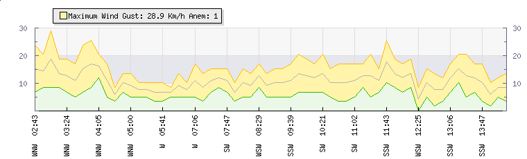 In the last few minutes the wind was Southerly at an average speed of 8 kmh, reaching up to 14 kmh and a low of 2 kmh. The gust strength is12 kmh above the minimum speed |