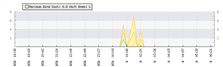In the last few minutes the wind was Westerly at an average speed of 0 kmh, reaching up to 0 kmh and a low of 0 kmh. The gust strength is0 kmh above the minimum speed |