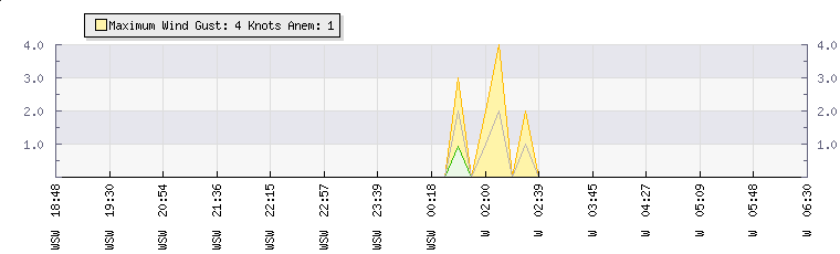 In the last few minutes the wind was Westerly at an average speed of 0 knots, reaching up to 0 knots and a low of 0 knots. The gust strength is0 knots above the minimum speed |