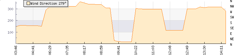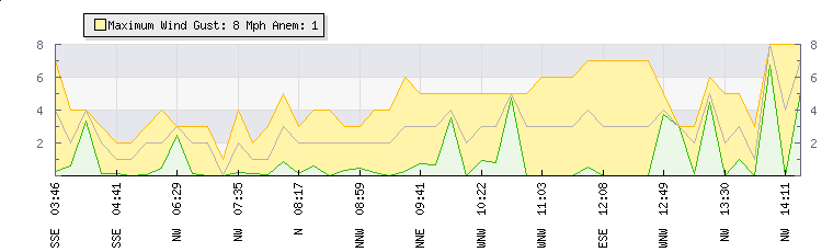 In the last few minutes the wind was East South East at an average speed of 3 mph, reaching up to 7 mph and a low of 0 mph. The gust strength is7 mph above the minimum speed |