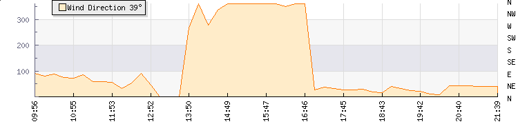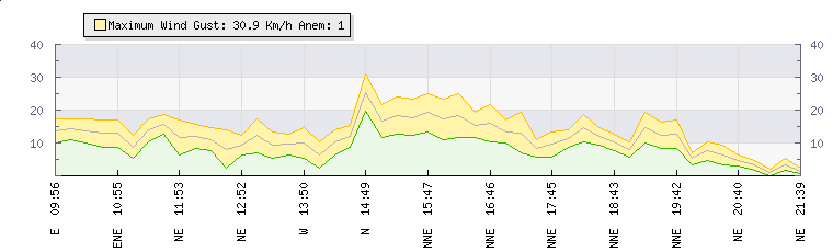 In the last few minutes the wind was North Easterly at an average speed of 6 kmh, reaching up to 9 kmh and a low of 4 kmh. The gust strength is5 kmh above the minimum speed |