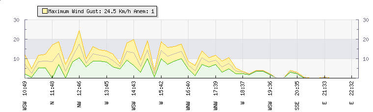 In the last few minutes the wind was South Easterly at an average speed of 0 kmh, reaching up to 0 kmh and a low of 0 kmh. The gust strength is0 kmh above the minimum speed |