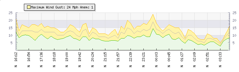 In the last few minutes the wind was Northerly at an average speed of 12 mph, reaching up to 15 mph and a low of 8 mph. The gust strength is7 mph above the minimum speed |