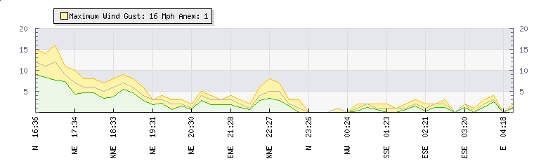 In the last few minutes the wind was East South East at an average speed of 2 mph, reaching up to 3 mph and a low of 1 mph. The gust strength is2 mph above the minimum speed |