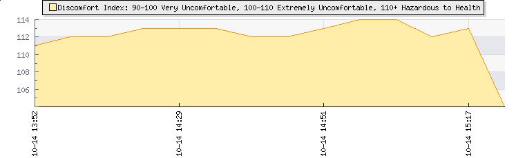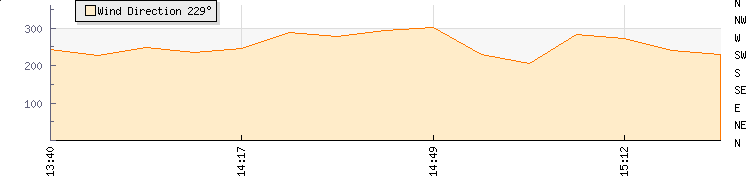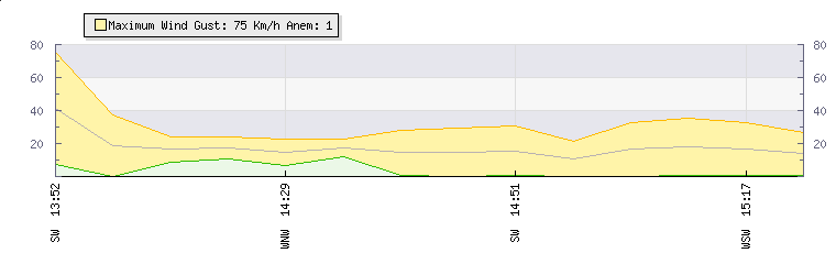In the last few minutes the wind was South Westerly at an average speed of 14 kmh, reaching up to 26 kmh and a low of 1 kmh. The gust strength is25 kmh above the minimum speed |