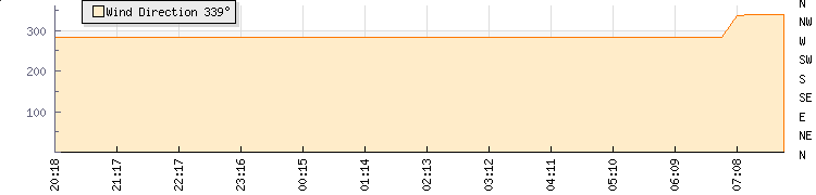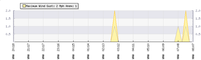 In the last few minutes the wind was West North West at an average speed of 0 mph, reaching up to 0 mph and a low of 0 mph. The gust strength is0 mph above the minimum speed |