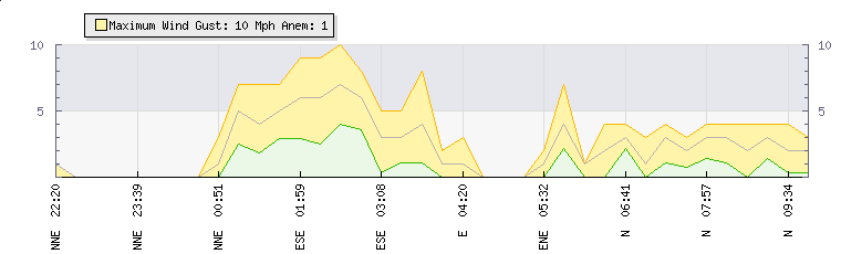 In the last few minutes the wind was Northerly at an average speed of 2 mph, reaching up to 4 mph and a low of 0 mph. The gust strength is4 mph above the minimum speed |