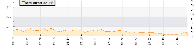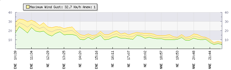 In the last few minutes the wind was North Easterly at an average speed of 12 kmh, reaching up to 13 kmh and a low of 11 kmh. The gust strength is2 kmh above the minimum speed |