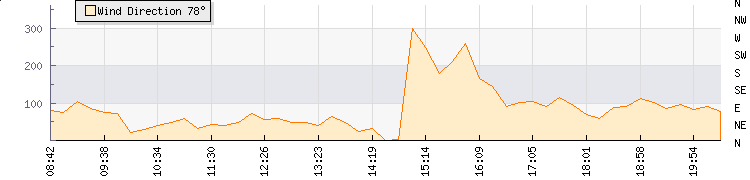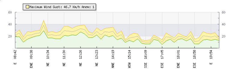 In the last few minutes the wind was Easterly at an average speed of 20 kmh, reaching up to 27 kmh and a low of 13 kmh. The gust strength is14 kmh above the minimum speed |