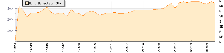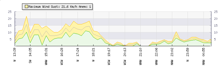 In the last few minutes the wind was North North East at an average speed of 5 kmh, reaching up to 6 kmh and a low of 4 kmh. The gust strength is2 kmh above the minimum speed |