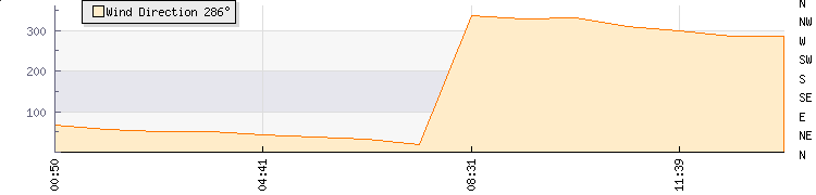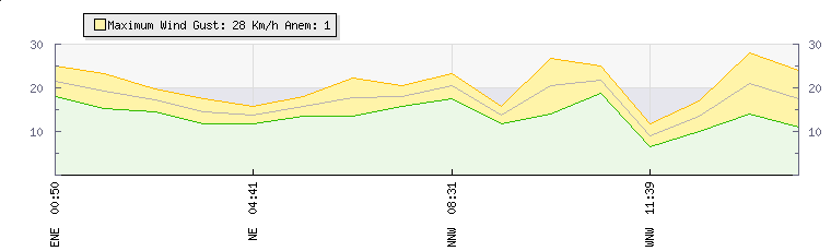 In the last few minutes the wind was North North West at an average speed of 14 kmh, reaching up to 16 kmh and a low of 12 kmh. The gust strength is4 kmh above the minimum speed |
