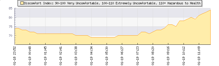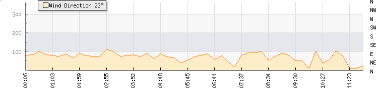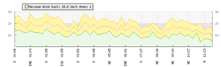 In the last few minutes the wind was Easterly at an average speed of 15 kmh, reaching up to 22 kmh and a low of 9 kmh. The gust strength is13 kmh above the minimum speed |