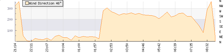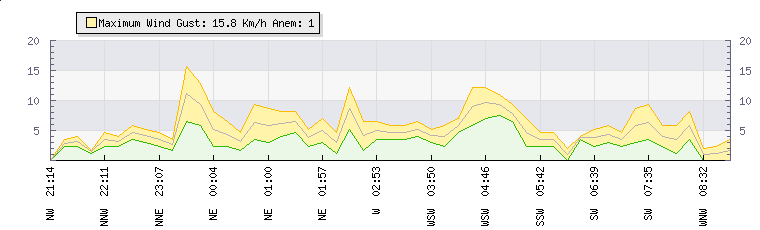 In the last few minutes the wind was South Westerly at an average speed of 6 kmh, reaching up to 9 kmh and a low of 4 kmh. The gust strength is5 kmh above the minimum speed |