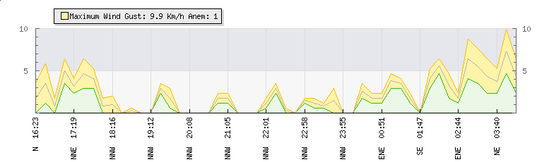 In the last few minutes the wind was Easterly at an average speed of 6 kmh, reaching up to 8 kmh and a low of 4 kmh. The gust strength is4 kmh above the minimum speed |