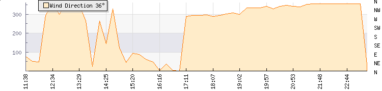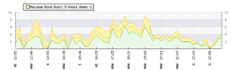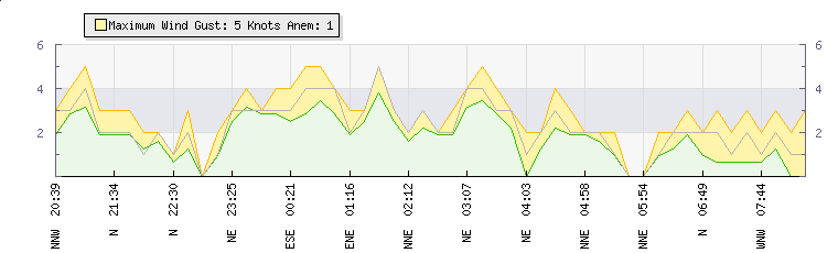 In the last few minutes the wind was North North West at an average speed of 4 knots, reaching up to 4 knots and a low of 3 knots. The gust strength is1 knots above the minimum speed |