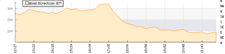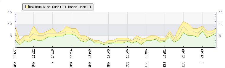 In the last few minutes the wind was East South East at an average speed of 5 knots, reaching up to 8 knots and a low of 3 knots. The gust strength is5 knots above the minimum speed |