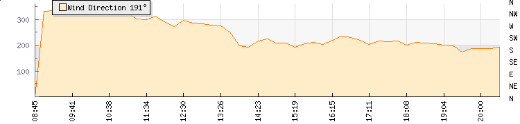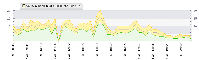 In the last few minutes the wind was Southerly at an average speed of 4 knots, reaching up to 5 knots and a low of 3 knots. The gust strength is2 knots above the minimum speed |