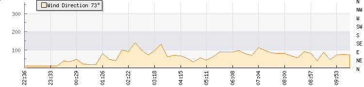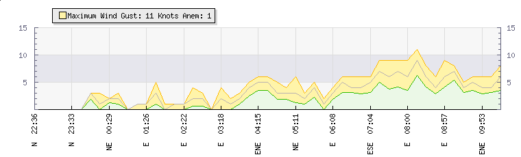 In the last few minutes the wind was Easterly at an average speed of 1 knots, reaching up to 1 knots and a low of 0 knots. The gust strength is1 knots above the minimum speed |