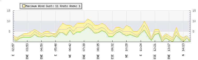 In the last few minutes the wind was North Easterly at an average speed of 1 knots, reaching up to 2 knots and a low of 0 knots. The gust strength is2 knots above the minimum speed |