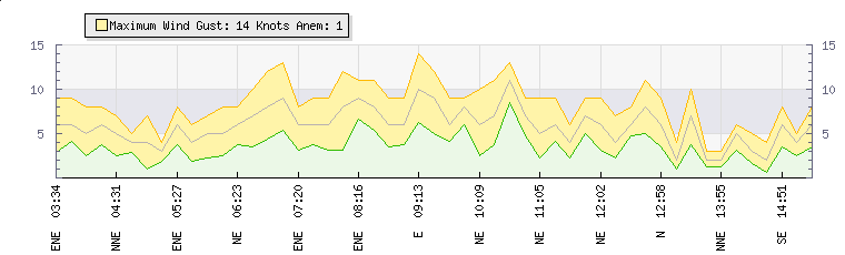 In the last few minutes the wind was North Easterly at an average speed of 2 knots, reaching up to 3 knots and a low of 1 knots. The gust strength is2 knots above the minimum speed |