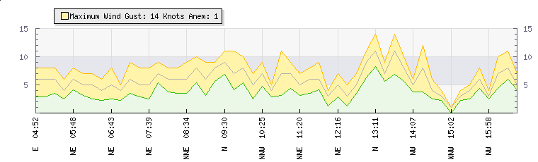 In the last few minutes the wind was West South West at an average speed of 3 knots, reaching up to 4 knots and a low of 2 knots. The gust strength is2 knots above the minimum speed |