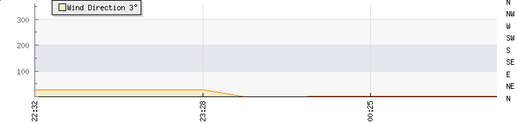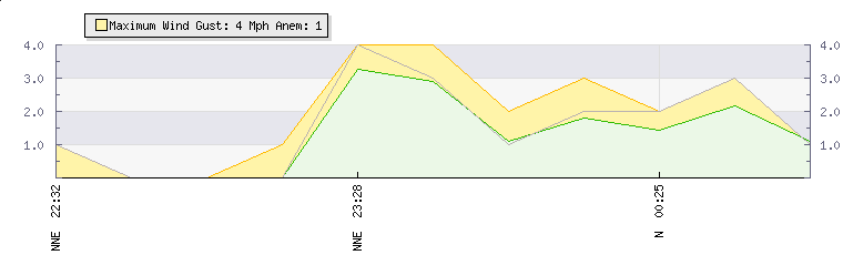 In the last few minutes the wind was North North East at an average speed of 1 mph, reaching up to 1 mph and a low of 0 mph. The gust strength is1 mph above the minimum speed |