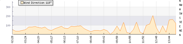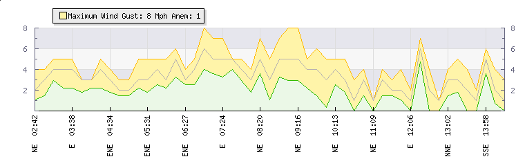 In the last few minutes the wind was North Easterly at an average speed of 4 mph, reaching up to 4 mph and a low of 3 mph. The gust strength is1 mph above the minimum speed |