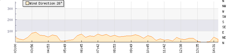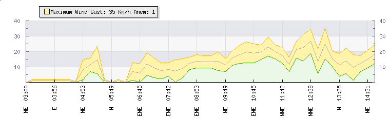 In the last few minutes the wind was North North East at an average speed of 18 kmh, reaching up to 23 kmh and a low of 12 kmh. The gust strength is11 kmh above the minimum speed |