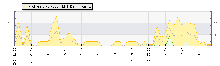In the last few minutes the wind was North Easterly at an average speed of 4 kmh, reaching up to 9 kmh and a low of 0 kmh. The gust strength is9 kmh above the minimum speed |