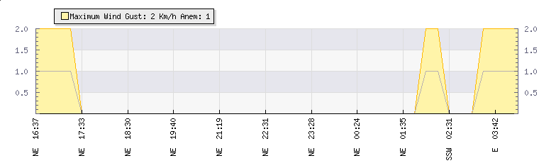In the last few minutes the wind was Southerly at an average speed of 0 kmh, reaching up to 0 kmh and a low of 0 kmh. The gust strength is0 kmh above the minimum speed |