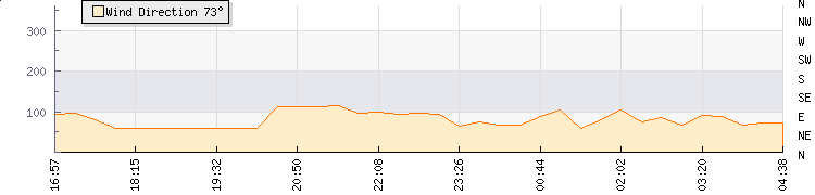 In the last few minutes the wind was East North East at an average speed of 1 knots, reaching up to 3 knots and a low of 0 knots. The gust strength is3 knots above the minimum speed |