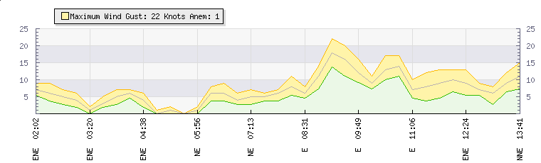 In the last few minutes the wind was East North East at an average speed of 9 knots, reaching up to 13 knots and a low of 5 knots. The gust strength is8 knots above the minimum speed |
