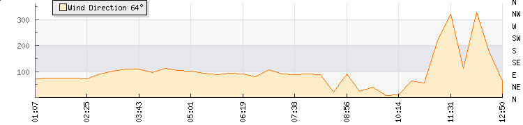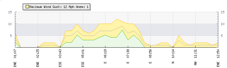 In the last few minutes the wind was East North East at an average speed of 1 mph, reaching up to 2 mph and a low of 0 mph. The gust strength is2 mph above the minimum speed |