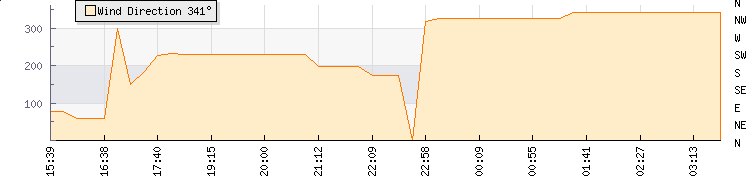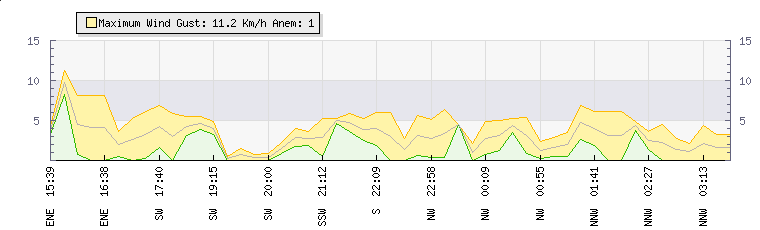 In the last few minutes the wind was North North West at an average speed of 3 kmh, reaching up to 6 kmh and a low of 0 kmh. The gust strength is6 kmh above the minimum speed |