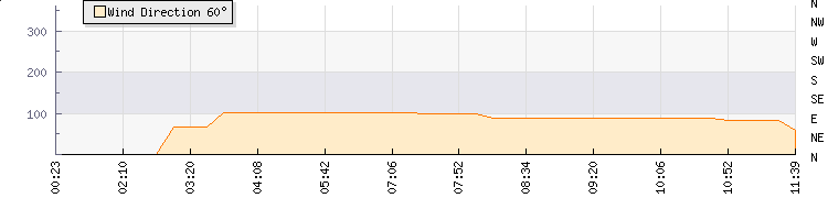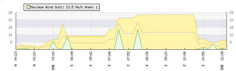 In the last few minutes the wind was Easterly at an average speed of 17 kmh, reaching up to 22 kmh and a low of 13 kmh. The gust strength is9 kmh above the minimum speed |