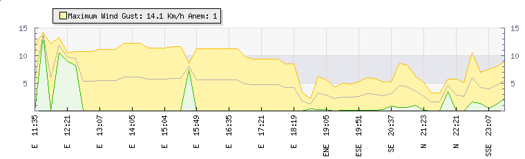 In the last few minutes the wind was Easterly at an average speed of 10 kmh, reaching up to 20 kmh and a low of 0 kmh. The gust strength is20 kmh above the minimum speed |