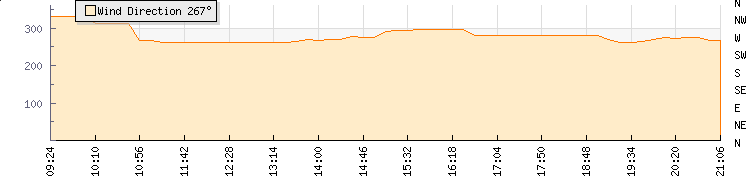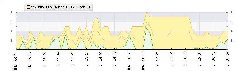 In the last few minutes the wind was Westerly at an average speed of 2 mph, reaching up to 3 mph and a low of 0 mph. The gust strength is3 mph above the minimum speed |