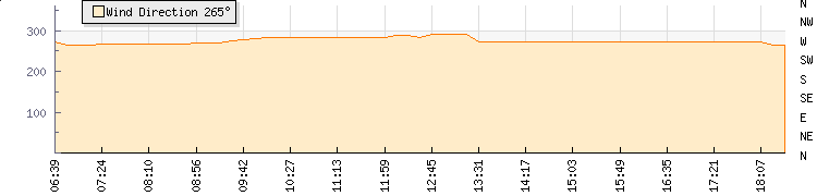 In the last few minutes the wind was Westerly at an average speed of 3 mph, reaching up to 6 mph and a low of 0 mph. The gust strength is6 mph above the minimum speed |