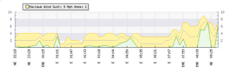 In the last few minutes the wind was East North East at an average speed of 4 mph, reaching up to 7 mph and a low of 0 mph. The gust strength is7 mph above the minimum speed |