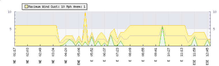 In the last few minutes the wind was North North East at an average speed of 3 mph, reaching up to 5 mph and a low of 0 mph. The gust strength is5 mph above the minimum speed |