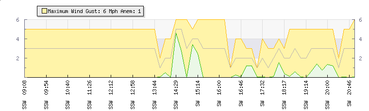 In the last few minutes the wind was South South West at an average speed of 3 mph, reaching up to 5 mph and a low of 1 mph. The gust strength is4 mph above the minimum speed |
