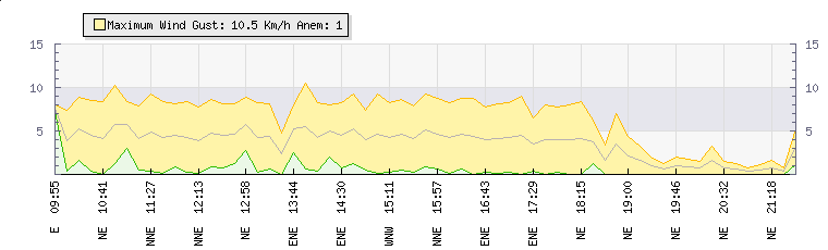 In the last few minutes the wind was North Easterly at an average speed of 1 kmh, reaching up to 1 kmh and a low of 0 kmh. The gust strength is1 kmh above the minimum speed |