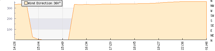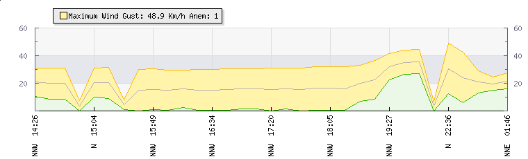 In the last few minutes the wind was North North West at an average speed of 22 kmh, reaching up to 36 kmh and a low of 9 kmh. The gust strength is27 kmh above the minimum speed |