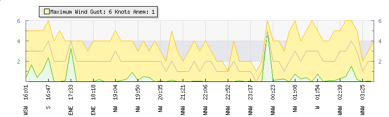 In the last few minutes the wind was Westerly at an average speed of 2 knots, reaching up to 4 knots and a low of 0 knots. The gust strength is4 knots above the minimum speed |